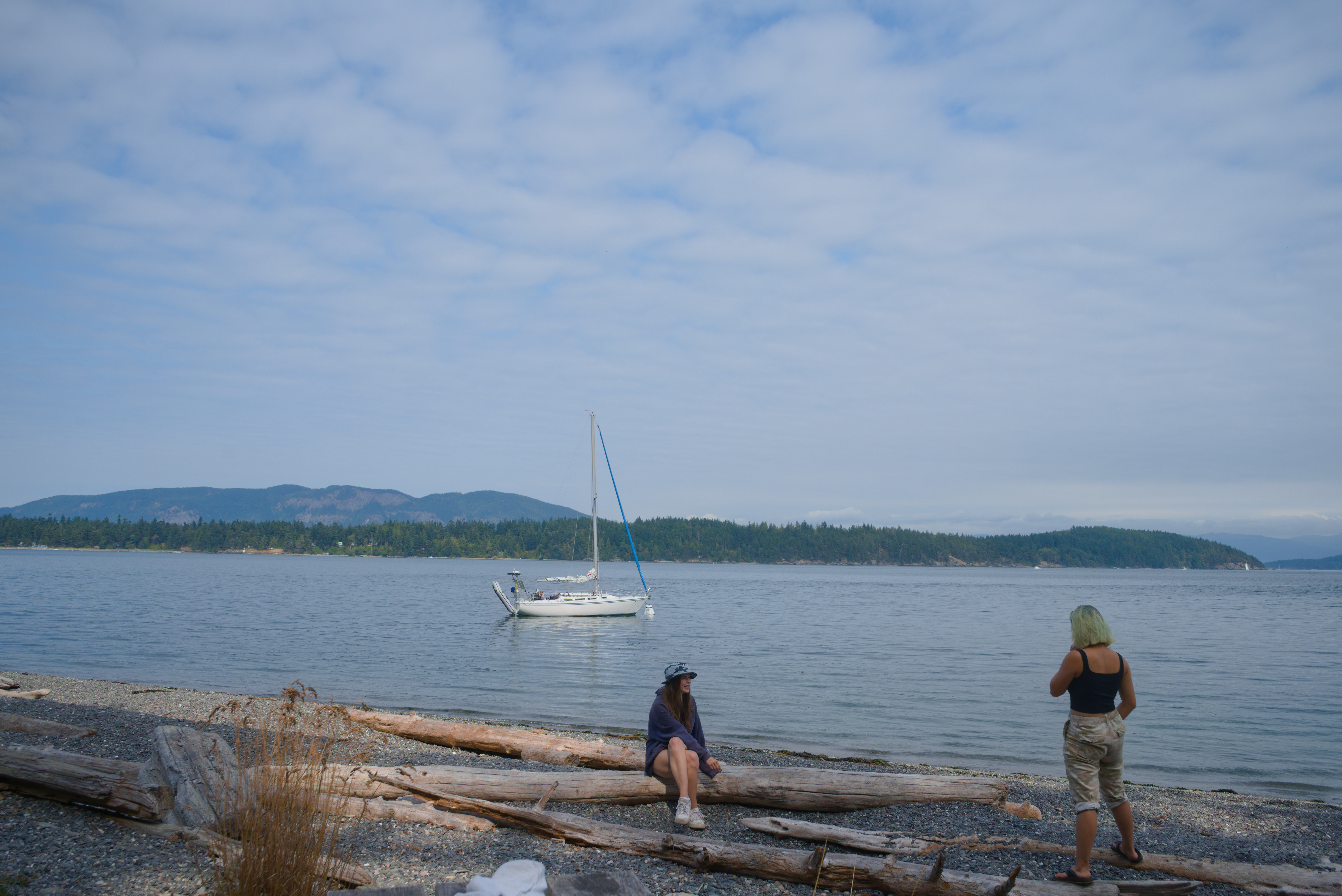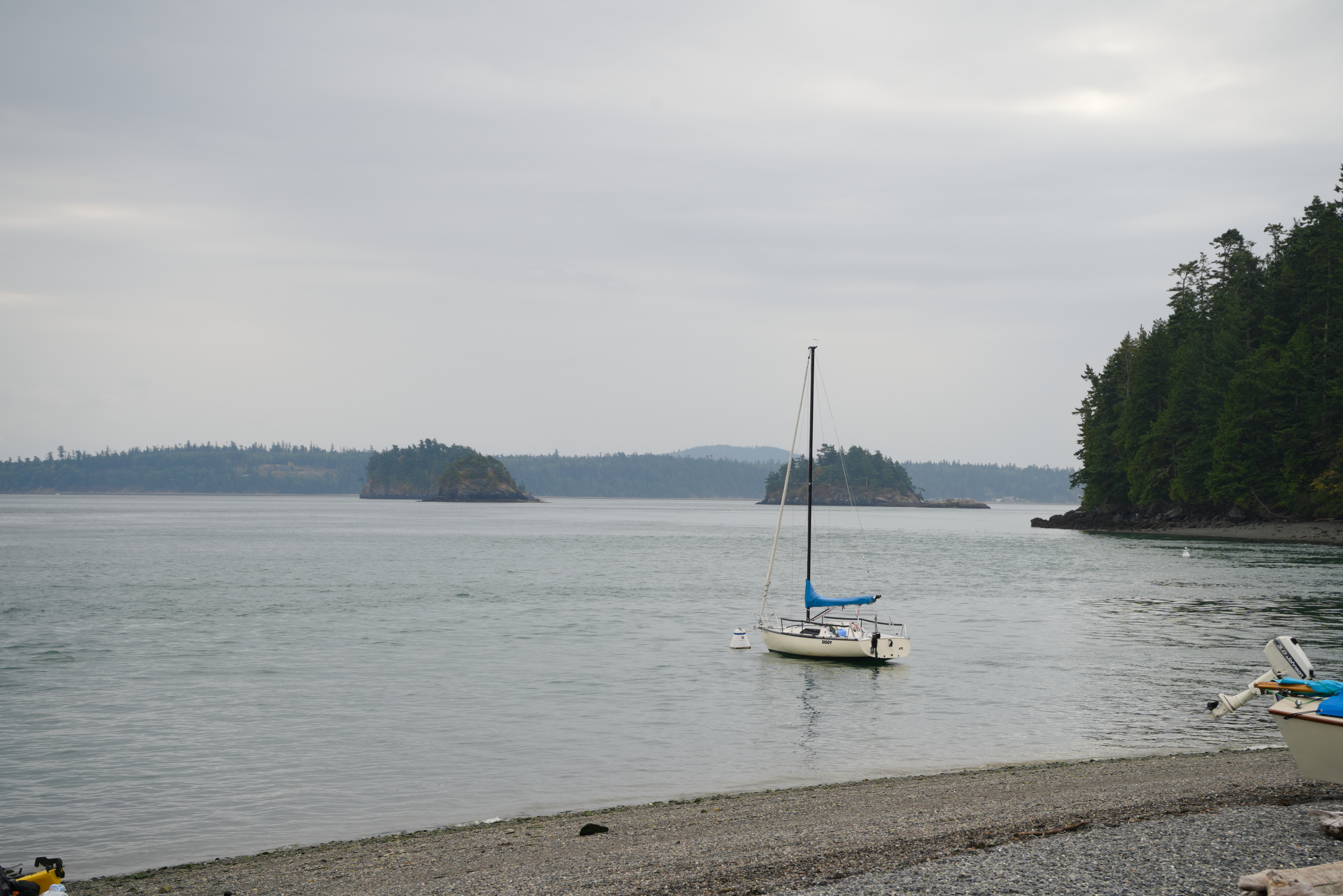 Today, more storytelling, less tech talk. At the beginning of the summer, I was invited to go sail camping with some friends from the sailing team. We sailed out of Anacortes on Annas Dad’s Sailboat, Siggy. With the lack of wind, we were trying to catch the outgoing tide to make it around Guemes Island. I arrived at the marina at 8 am, which meant I woke up at 6 am. Nobody was there, and I slept in my car until 11. The first to arrive was Anna, who let me into the marina, where I got the first photo of the trip. Out beautiful little yacht, Siggy. A 23-and-a-half-foot-long swing-keel boat was one of two hundred made. I loved the design as it was simple and light with an asymmetrical spinnaker.